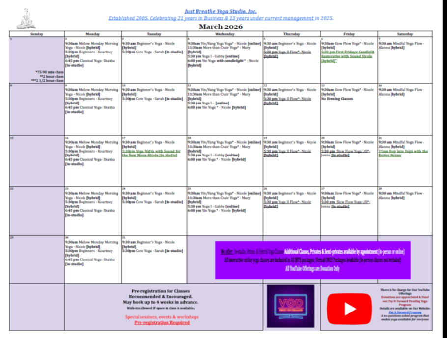 If winter weather becomes unsafe for travel, Just Breathe Yoga Studio will switch to online-only and cancel in-studio classes or those portions of hybrid classes. Everyone must book for class so that students can be notified of these situations. Thank you.